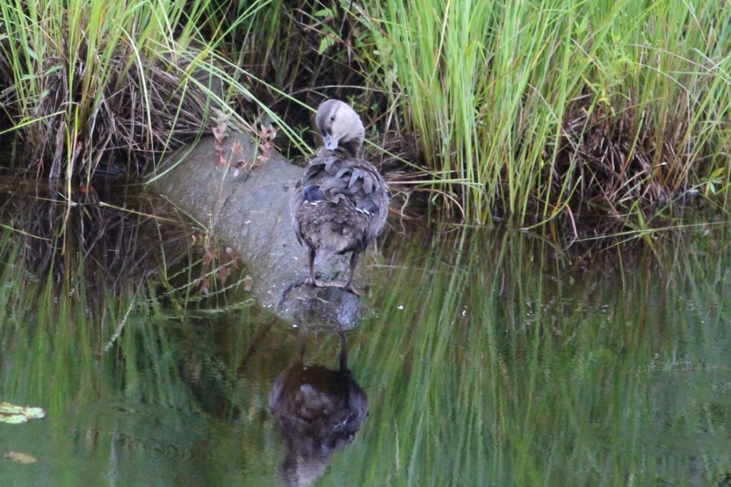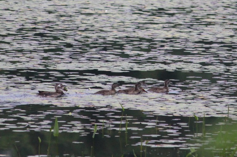 The other Duck (member of the Family Anatidae) spotted occasionally was the Wood Duck (Aix sponsa). Wood Ducks are remarkable (to me, at least) for nesting within tree-holes, something that seems strange for a Duck to be doing. I photographed a female Wood Duck leading a group of young across the marsh. Interestingly, the adult has something in its bill, I believe it’s the flower of a lily (Nymphaea).