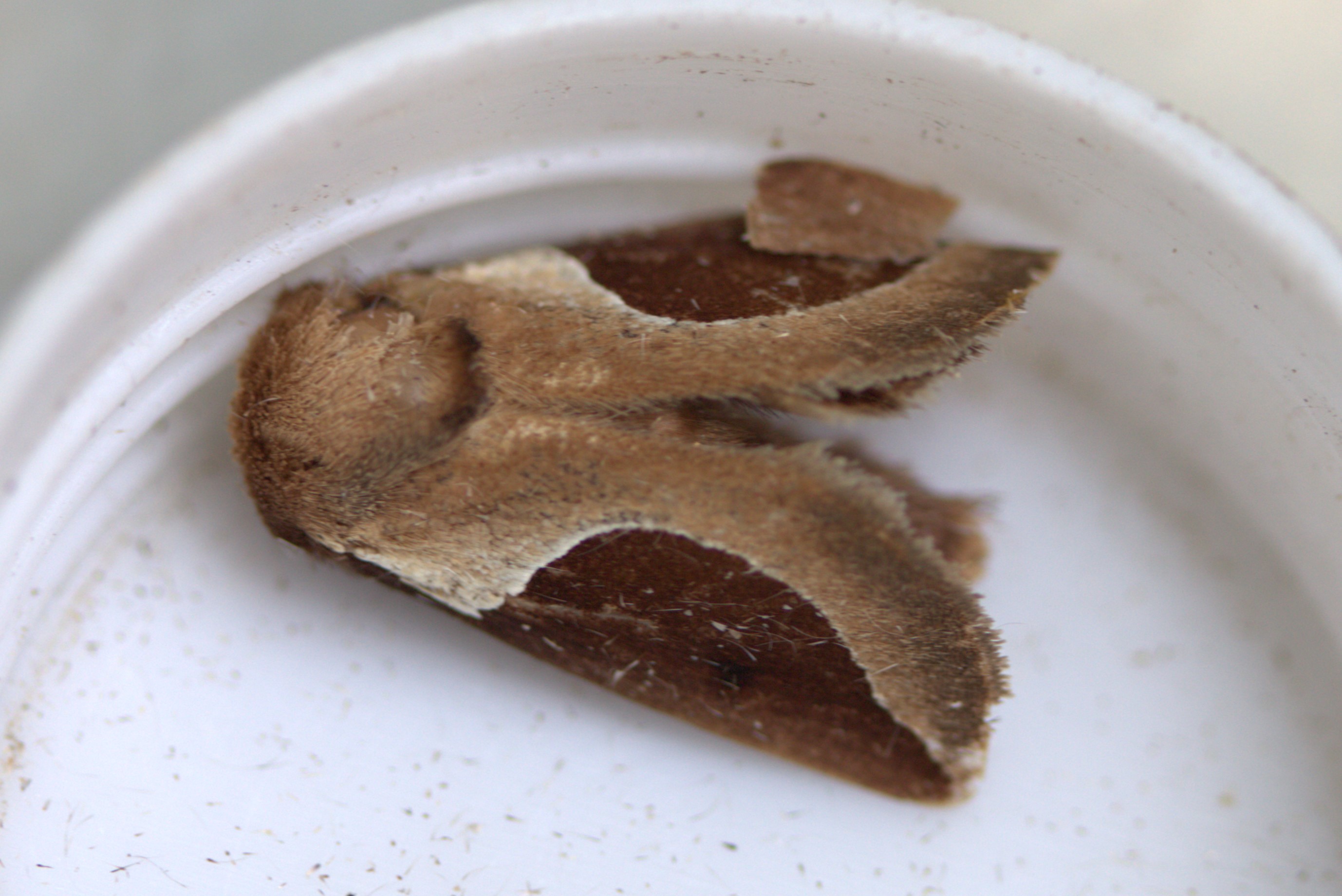 The Limacodidae are known as “Slug Moths” in reference to their bizarre caterpillars (see below). Although there are almost 2000 named species, many of them are tropical and I only observed one at the mothing event, the Skiff Moth. These moths feed on various trees and woody plants as larvae including “birch, blueberry, oak, poplar, and willow” (Beadle and Leckie 2012). Some slug moths (especially the tropical members of this group) have bristly spines that can give a nasty sting, but the Skiff moth larva doesn’t seem to have any of these venomous defenses, perhaps relying entirely on its strange non-caterpillar appearance for evading predation or disturbance.