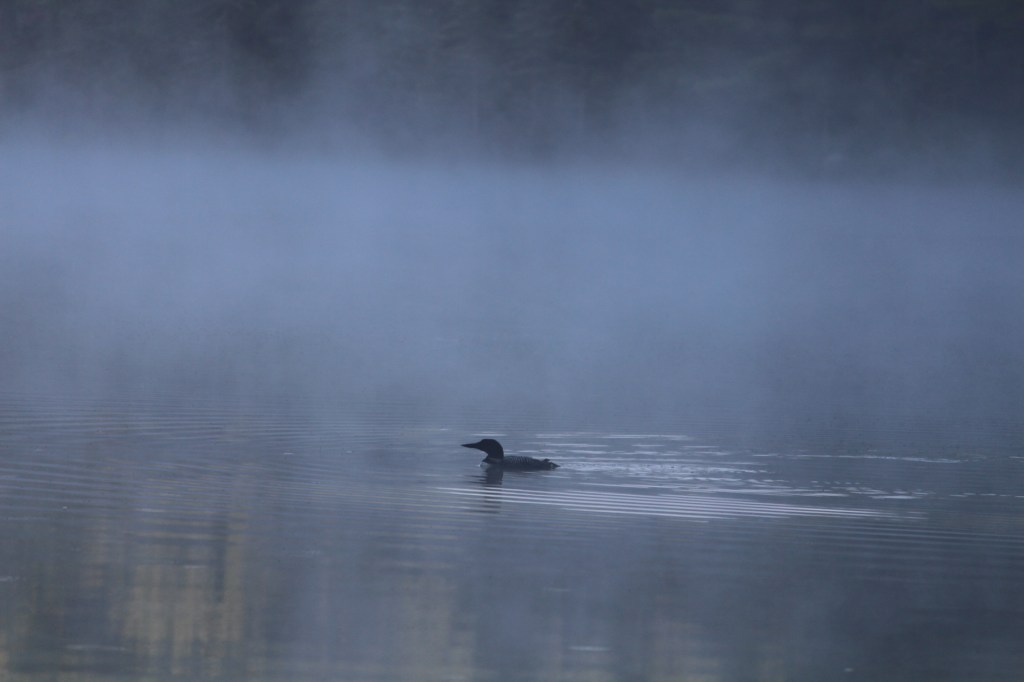 As I came upon an opening in the woods I was rewarded with an excellent view of the misty lake in the morning, with its signature Algonquin Park inhabitant: the Common Loon (Gavia immer). No matter how many times I hear that undulating call or see this distinctive bird dive beneath a lake to reappear surprisingly far away, I will be amazed. In Ancient Life of the Great Lakes Basin it’s mentioned that Loons are an ancient group of birds with fossils being found in the Cretaceous Period, contemporary with non-avian Dinosaurs. “One gets goose bumps imagining the characteristic tremulo calls and haunting wails of the loon song echoing over the lakes and swamps of the Cretaceous over 60 million years ago.” (Holman, 1995). We will likely never know if these ancient members of the Loon lineage (Gaviiformes) had similar calls, but the image is certainly a beautiful one.