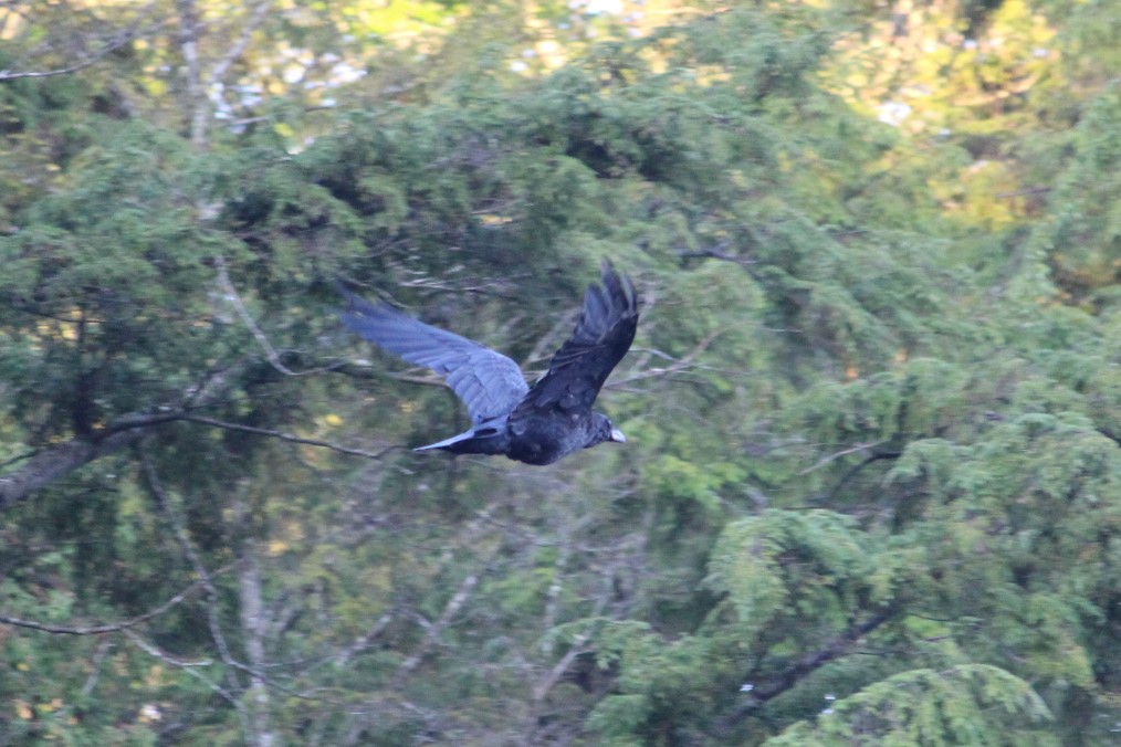 While admiring the majesty of the Loon on the lake, I was distracted by a series of strange noises from above me in a tree. The noises were certainly a bird, but I had no idea what sort until the bird took off and flew away with heavy wingbeats. The bird in question was a Common Raven (Corvus corax) and they’re renowned for being diverse vocalists. One of the vocalizations they don’t make is a “caw”ing sound, unlike their relatives and the species often confused with them: the Common Crow (Corvus brachyrhynchos). The power and size of a Raven impress me every time I see them, enhanced always by my readings of Bernd Heinrich who has devoted much time and energy into exploring these magnificent birds’ ecology and behaviour (see Mind of the Raven, Ravens in Winter, and most Bernd Heinrich books mention Ravens at one point or another).