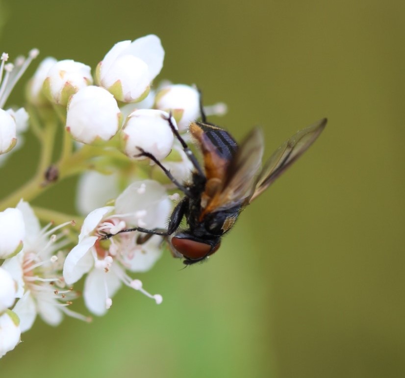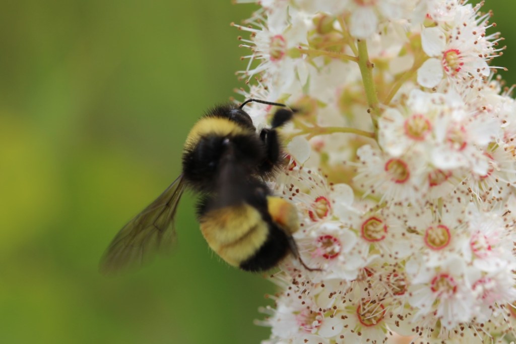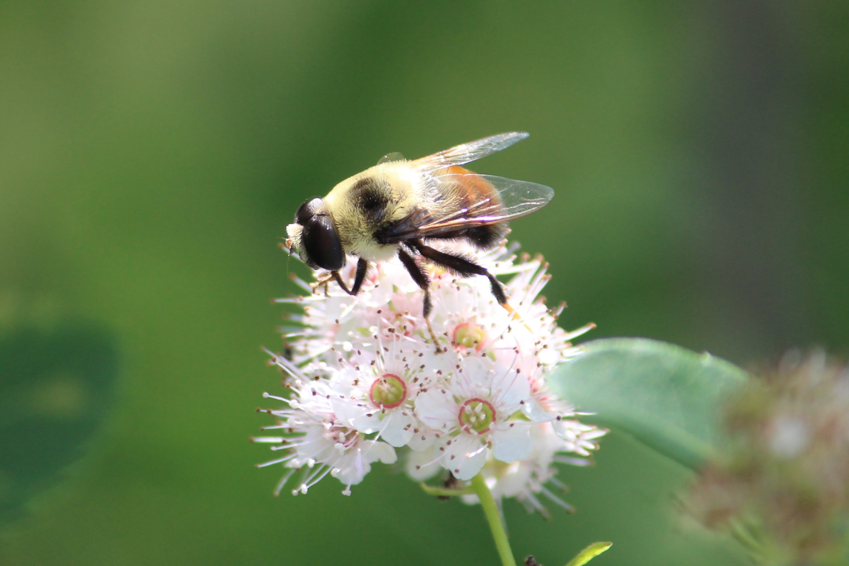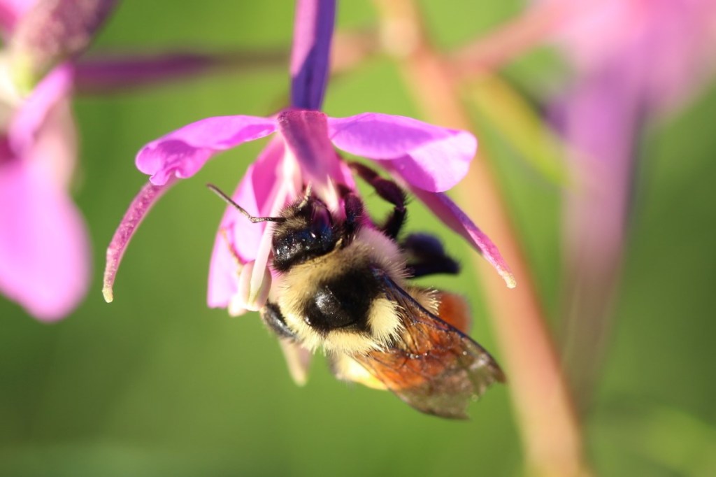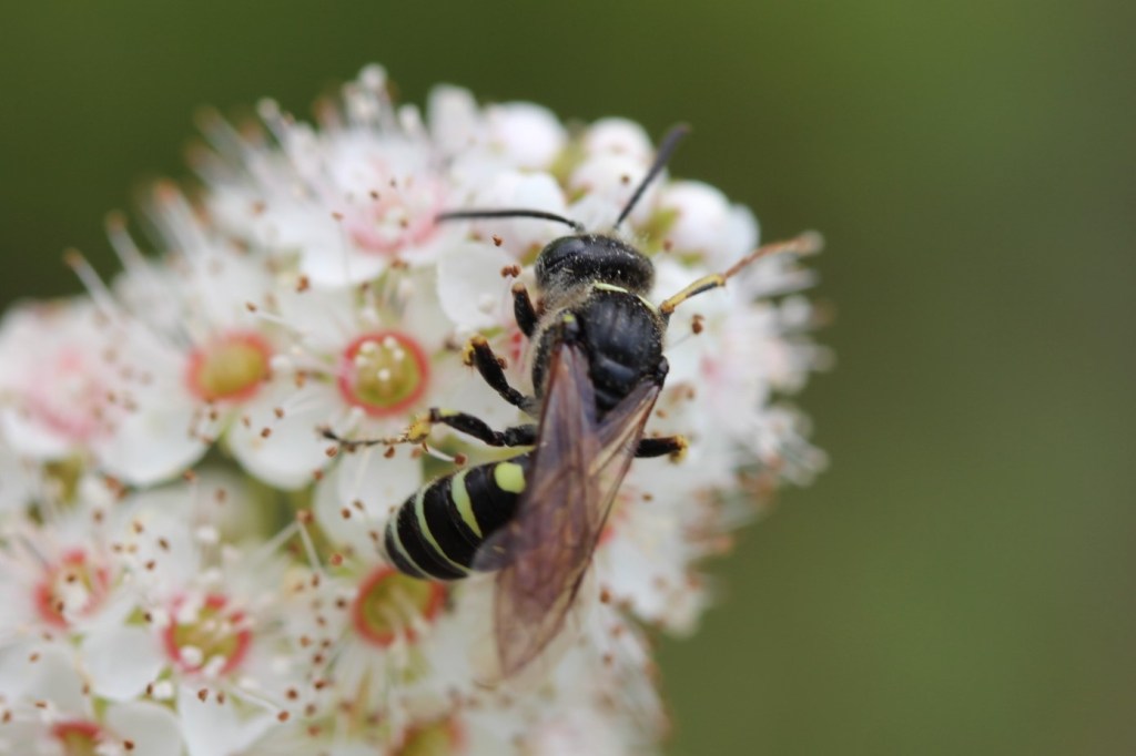Another flower-visiting wasp was the intriguingly named “Parasitic Aerial Yellowjacket” (Dolichovespula arctica). As you might have guessed, this species is parasitic… and if you know how social parasitism works, then you could have guessed its host: another member of the Dolichovespula genus (Bald-faced hornets, D. arenaria or D. alpicola) (Holm 2021). After a non-parasitic wasp nest is beginning in Spring, a queen of this species will join and start laying her own eggs. She doesn’t produce workers like her hosts, but instead produces female and male reproductives only and through social aggression she forces the host’s workers to rear her young (Holm 2021). After some of her young are reared, she will kill the host queen and the nest will start to collapse (as yellowjacket/hornet nests do every year in the fall), workers will lay their own eggs which will hatch into reproductive male wasps (Holm 2021). After mating, the D. arctica queens will find hibernation sites in order to wait out the winter and start the cycle of revolution all over again next spring.