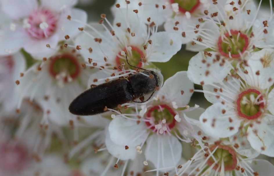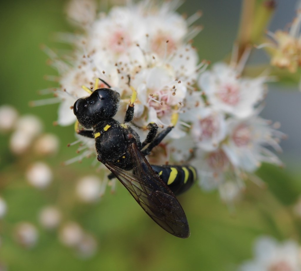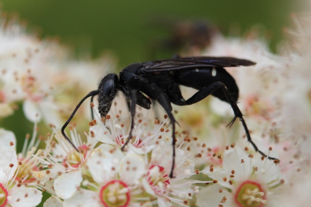 Of course, not all flower visitors were wasp mimics, many were the real thing. A crabronid of the genus Ectemnius was seen visiting a flower and another crabronid was seen emerging from its burrow at a different part of the trail. When I was first reviewing my photos I assumed that both members of the family Crabronidae that I observed dug into the ground for their nest burrows. Crabronidae is associated in my mind with “burrowing solitary wasps”. But Ectemnius wasps actually often nest in dead wood or plant stems (Holm 2021).