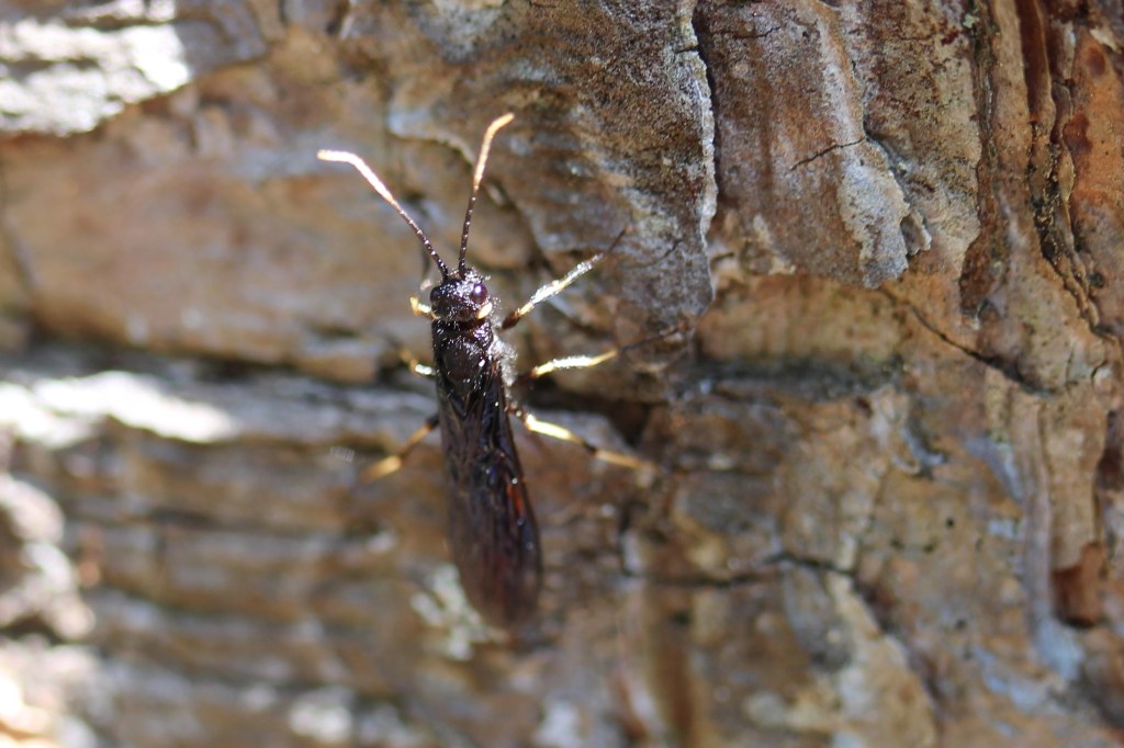 This strange-looking bee lays its eggs inside of constructions left behind by other insects, “especially beetle holes in wood, but they may also use pine cones” according to Wilson and Carril (2016). Their nest cells are divided with resin which is where they get their common name of “resin-bee”. Their generic name “Heriades” means “wool” referring to their woolly hairs, evident in the photo.