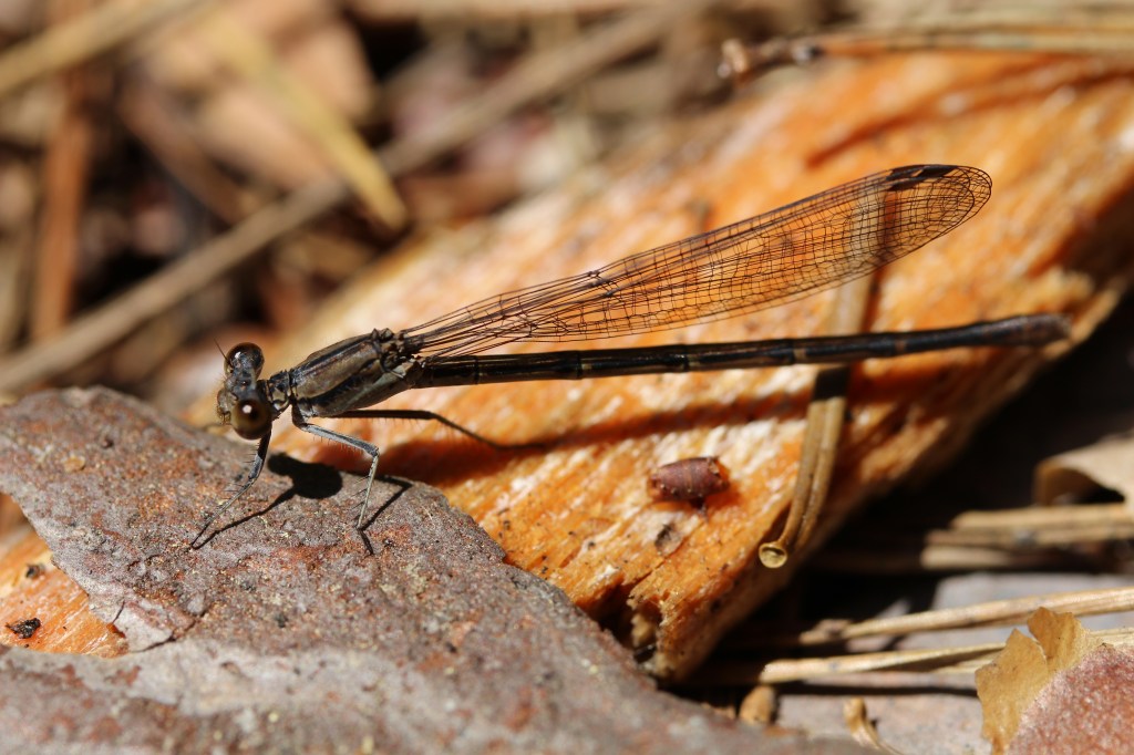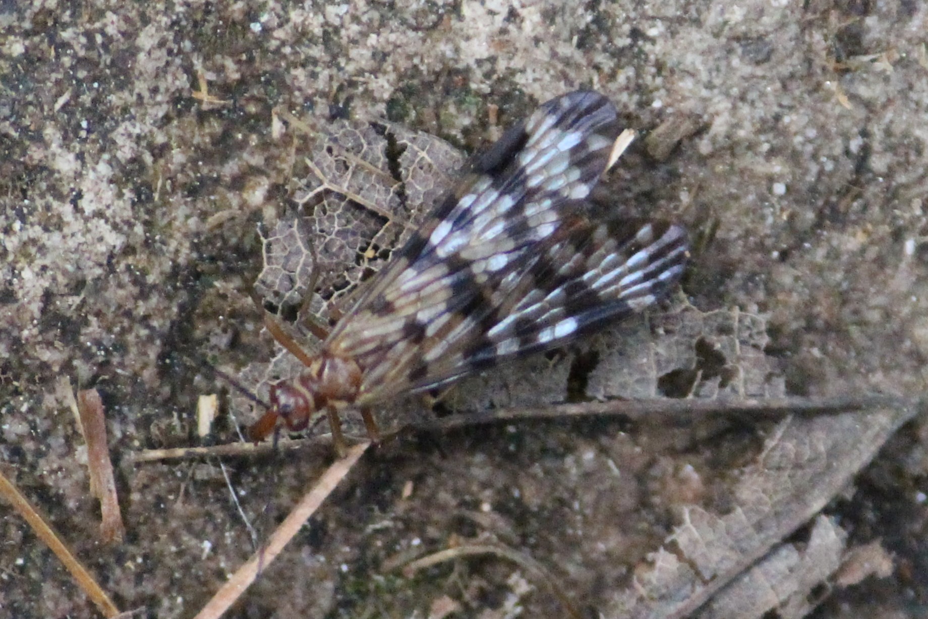 Although her colouration may remind you of a paper wasp or other social, stinging wasp, the long ovipositor curled over her back indicates that she is in fact something quite different: a parasitic wasp. This female will lay her eggs inside the nest of a leafcutter bee (bees in the family Megachilidae), and the larvae that hatch will locate and consume their host bee larvae (Holm 2021). Holm, in her amazingly detailed books on common garden wasps, says this about the larval stage of this wasp: “The larva is initially equipped with sensory and locomotive hairs on its head and body to help it find the host as it moves around the dark nest cell… has an oversized head, and large mandibles used to kill the host larva and destroy any other Leucospis eggs. Like many cleptoparasitic bees, the larva loses most of these prey-finding apparatus after molting” (Holm 2021).