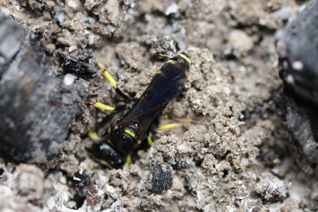 In the photo above, you can clearly see the smile emblazoned on the Smiling Mason Wasp’s thorax. These wasps lay their eggs in pre-existing cavities, creating several nest cells by dividing the cavity with mud walls (Holm 2021). You can think of each nest cell as a nursery for individual wasp larvae, as the Smiling Mason Wasp female lays a single egg in each chamber (and hangs it from the ceiling by a silken thread) (O’Neill 2001). Each nursery is filled with several paralyzed caterpillars for the larva to consume upon hatching (Holm 2021).