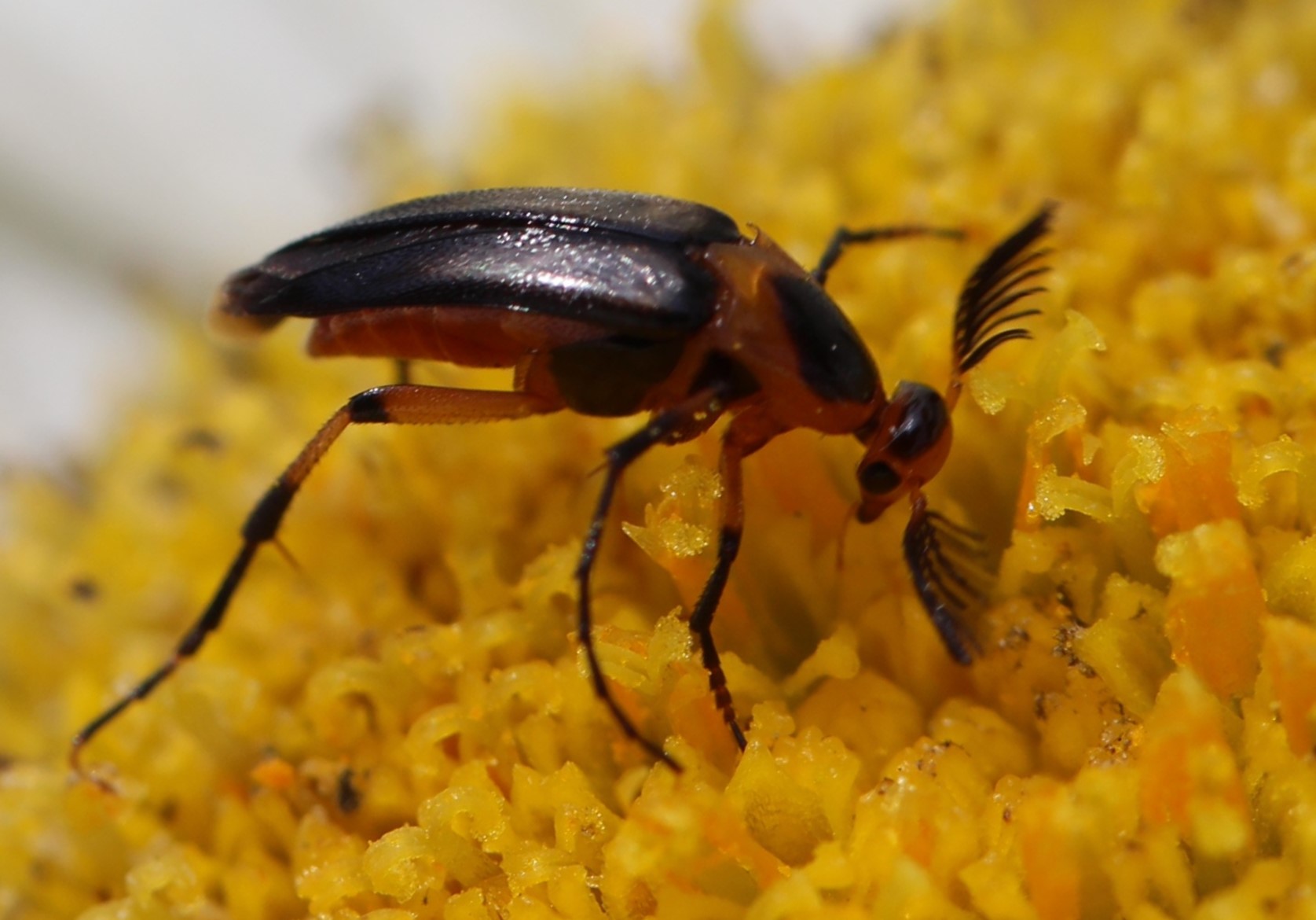 A Bordered Wedge-shaped Beetle (Macrosiagon limbata) in my backyard this past summer. He (you can tell it’s a male because of the impressive antler-like antennae) had shoved his head deep into this flower before pushing back to reveal his antennae.