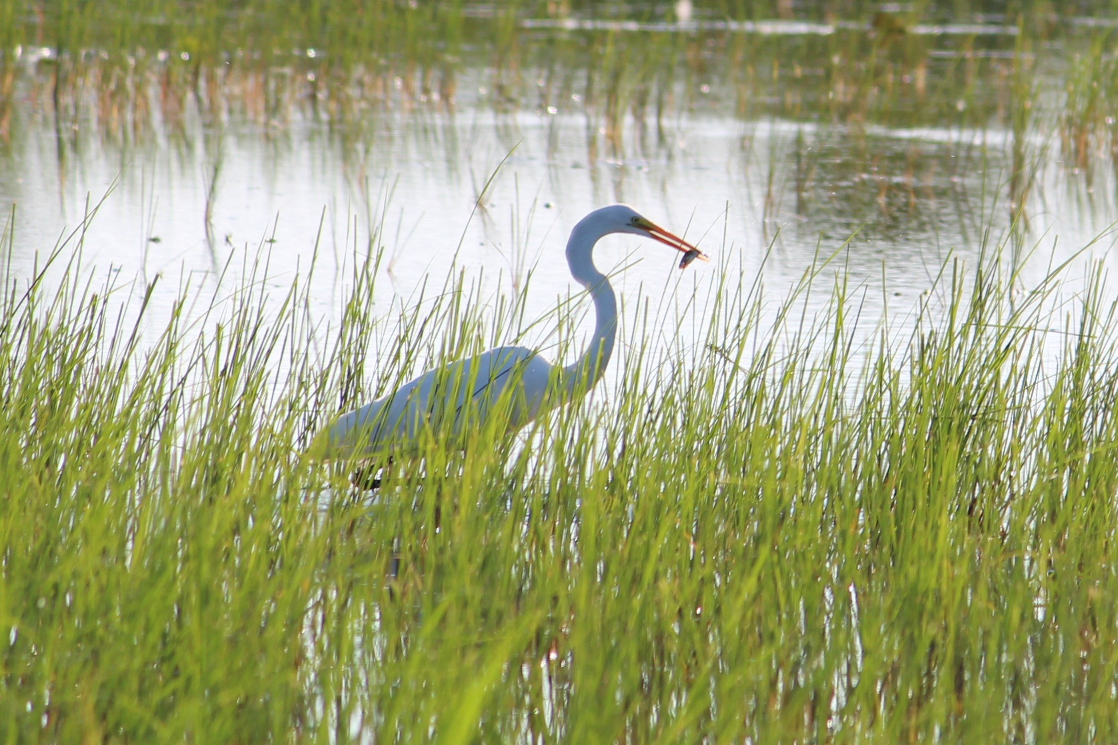A Great Egret (Ardea alba) feasting on fish in Long Point in July, 2024.