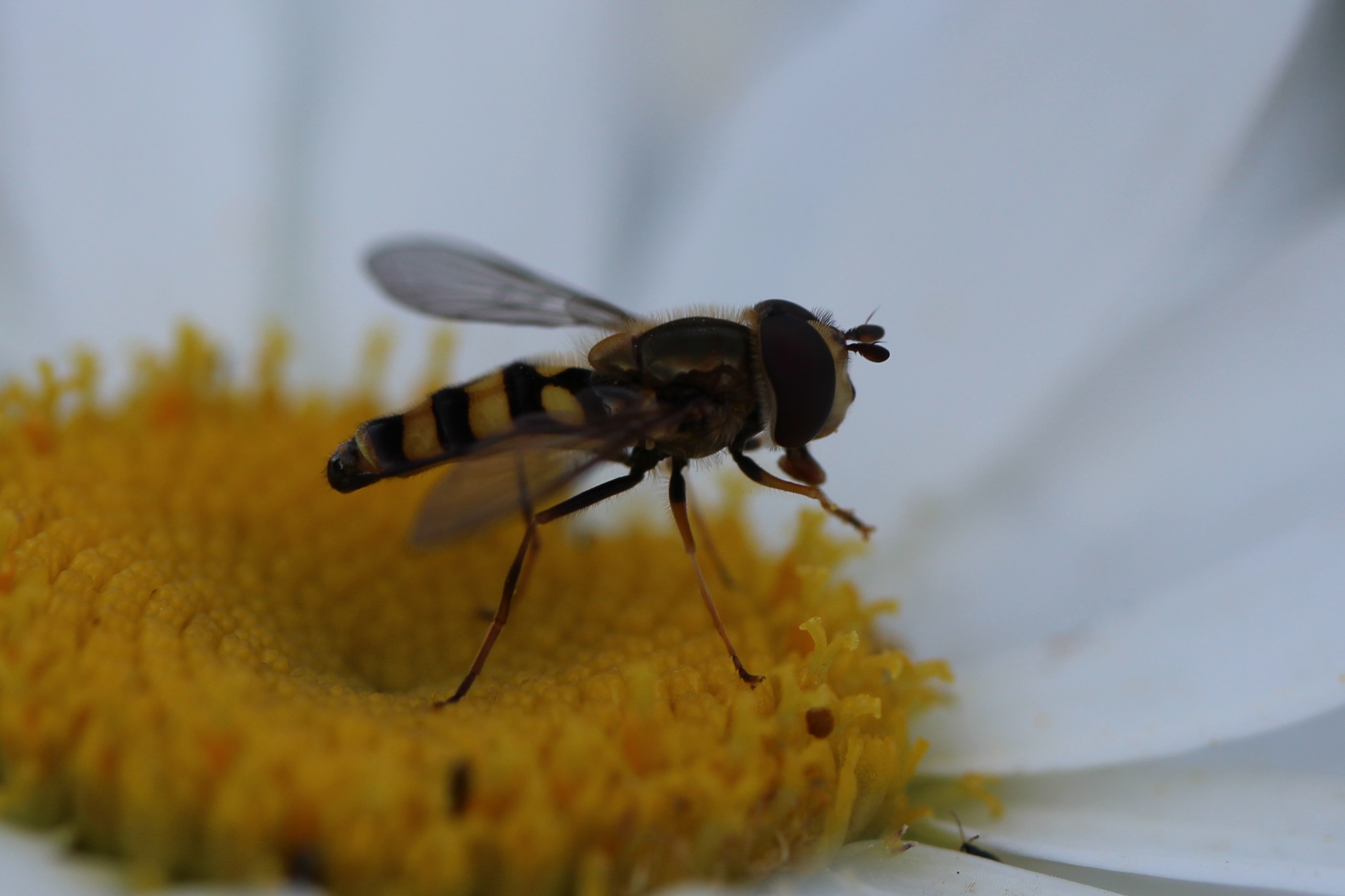 Long-tailed Aphideater (Eupeodes americanus) in my backyard in October. The name refers to the larva which consumes aphids, while the adult feeds on nectar.