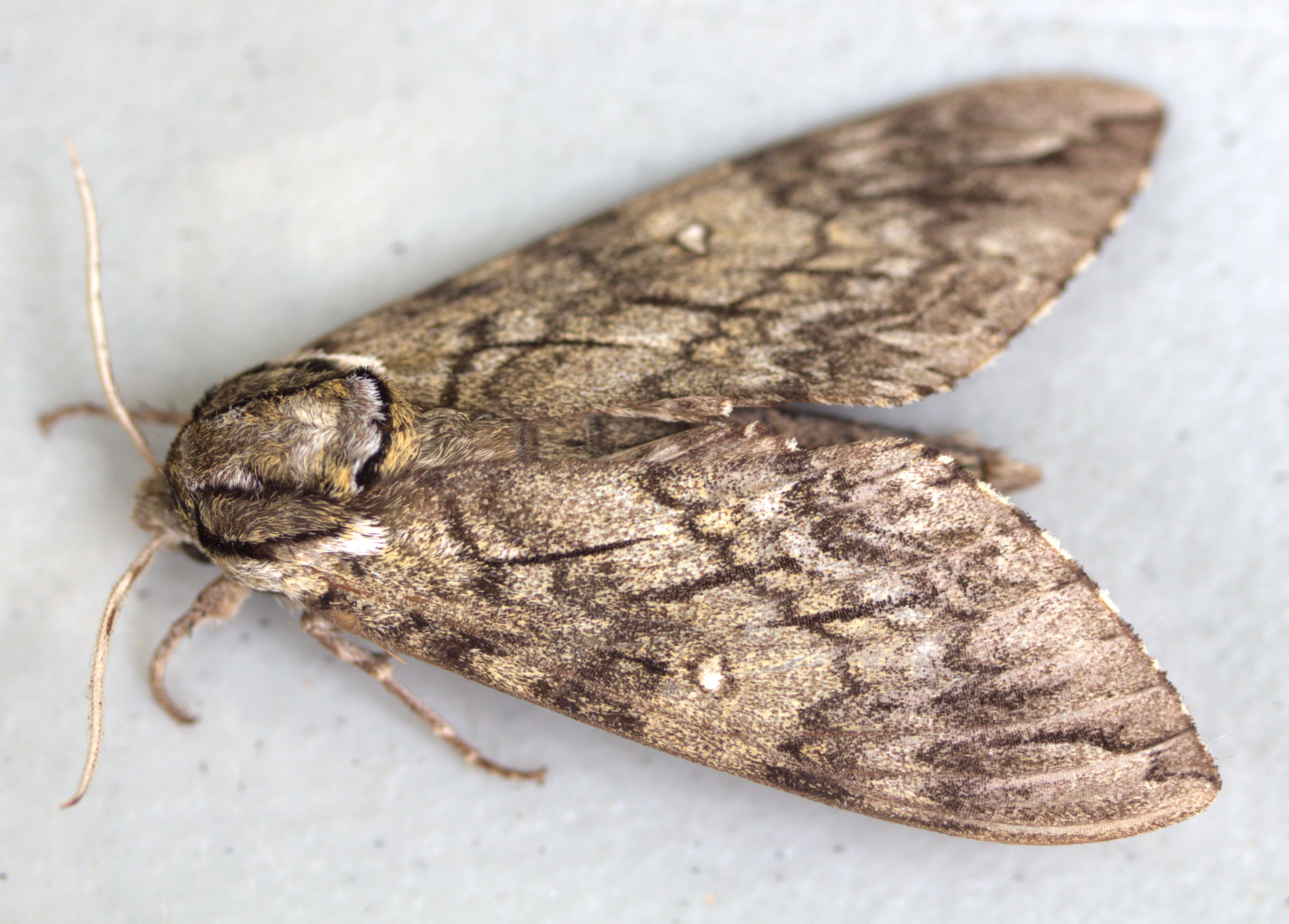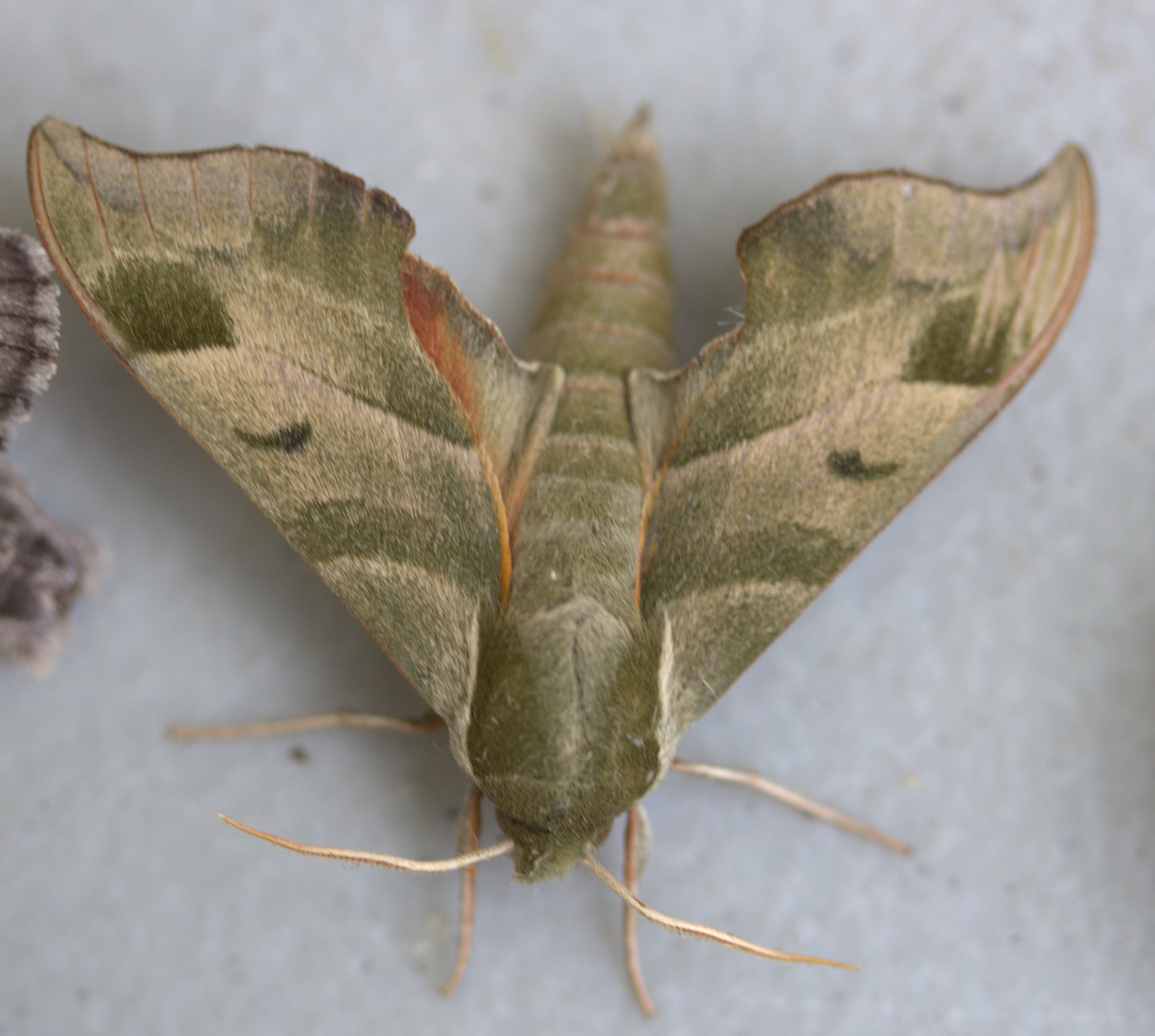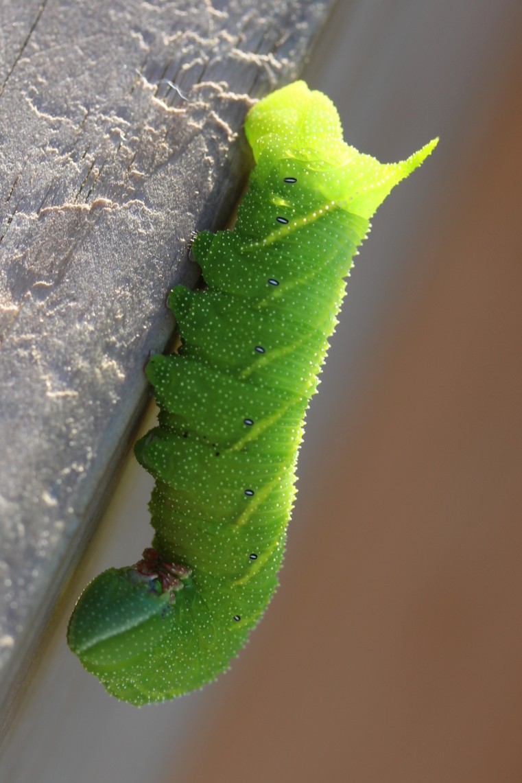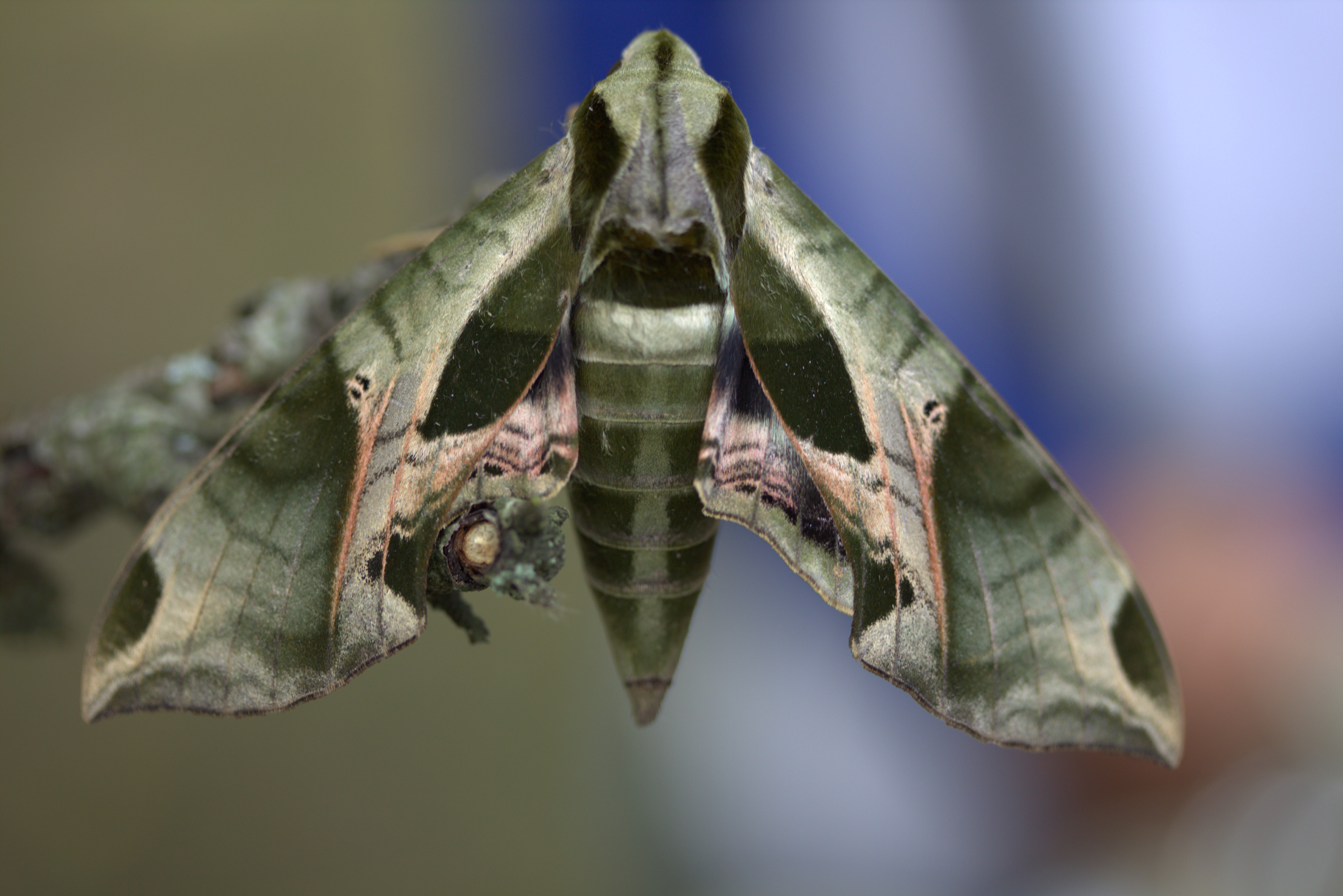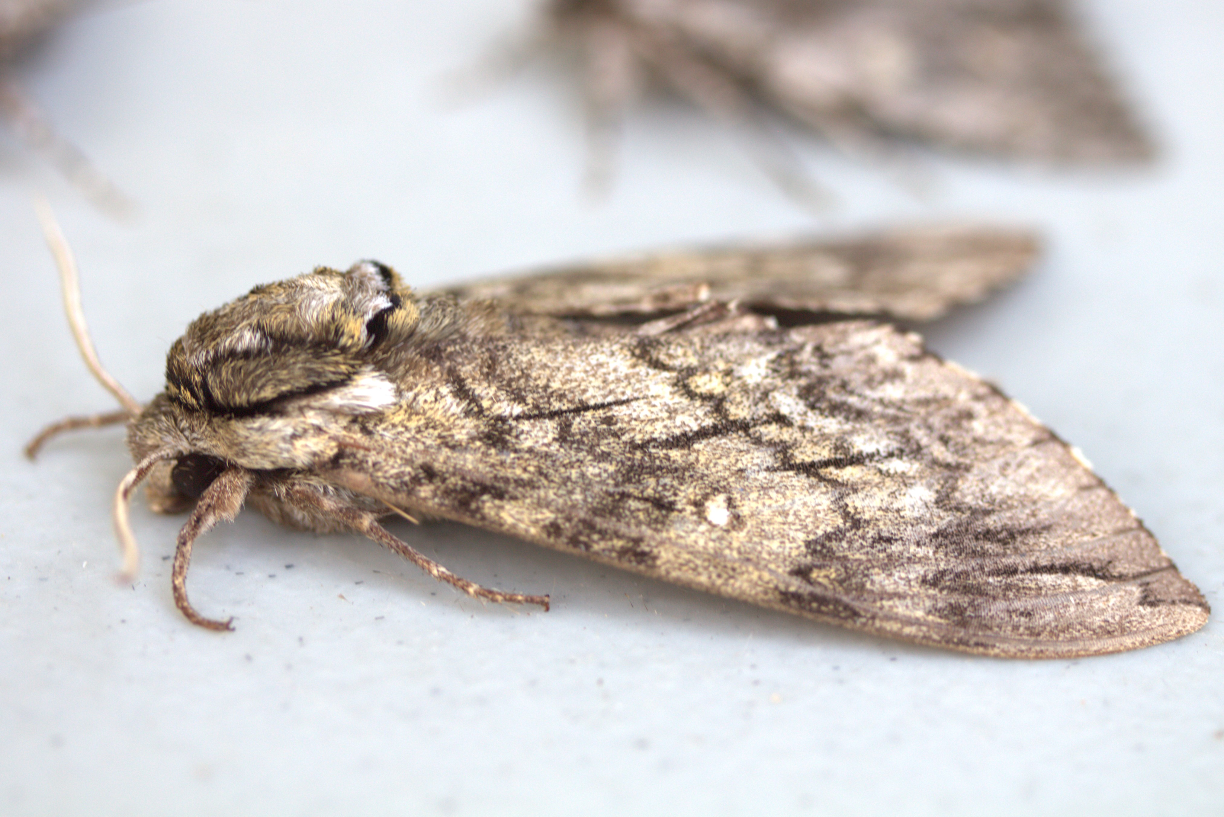 Sphinx Moths, or Hawk Moths (Family Sphingidae) are some of the largest moths in our area and are quite stunning to see. This family includes almost 1500 named species worldwide, and some very surprising members such as the Hummingbird Hawkmoths which are day-flying nectar feeders that look shockingly like insect hummingbirds. Larval Sphinx Moths are often called “Hornworms” because of the projections on some of their heads which resemble horns. Some hornworms are well known for their destructive feeding habits such as the Tomato/Tobacco Hornworm (Manduca sexta). Adult Sphinx moths feed at flowers with their long proboscis (Beadle and Leckie 2012).