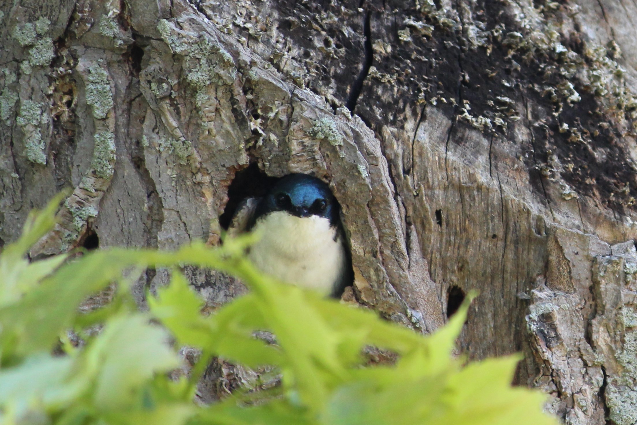 I was excited to discover a Tree Swallow was staying on the property where I was staying for this eventful birding weekend. Throughout my stay, I would occasionally check on the treehole where I had seen the inquisitive face staring out at me. Sometimes the beak would be open, chittering away, sometimes the bird would cock its head to the side as if examining the world outside its snug abode, and other times there would be no face filling the cavity, only a dark entrance to a hidden nest.