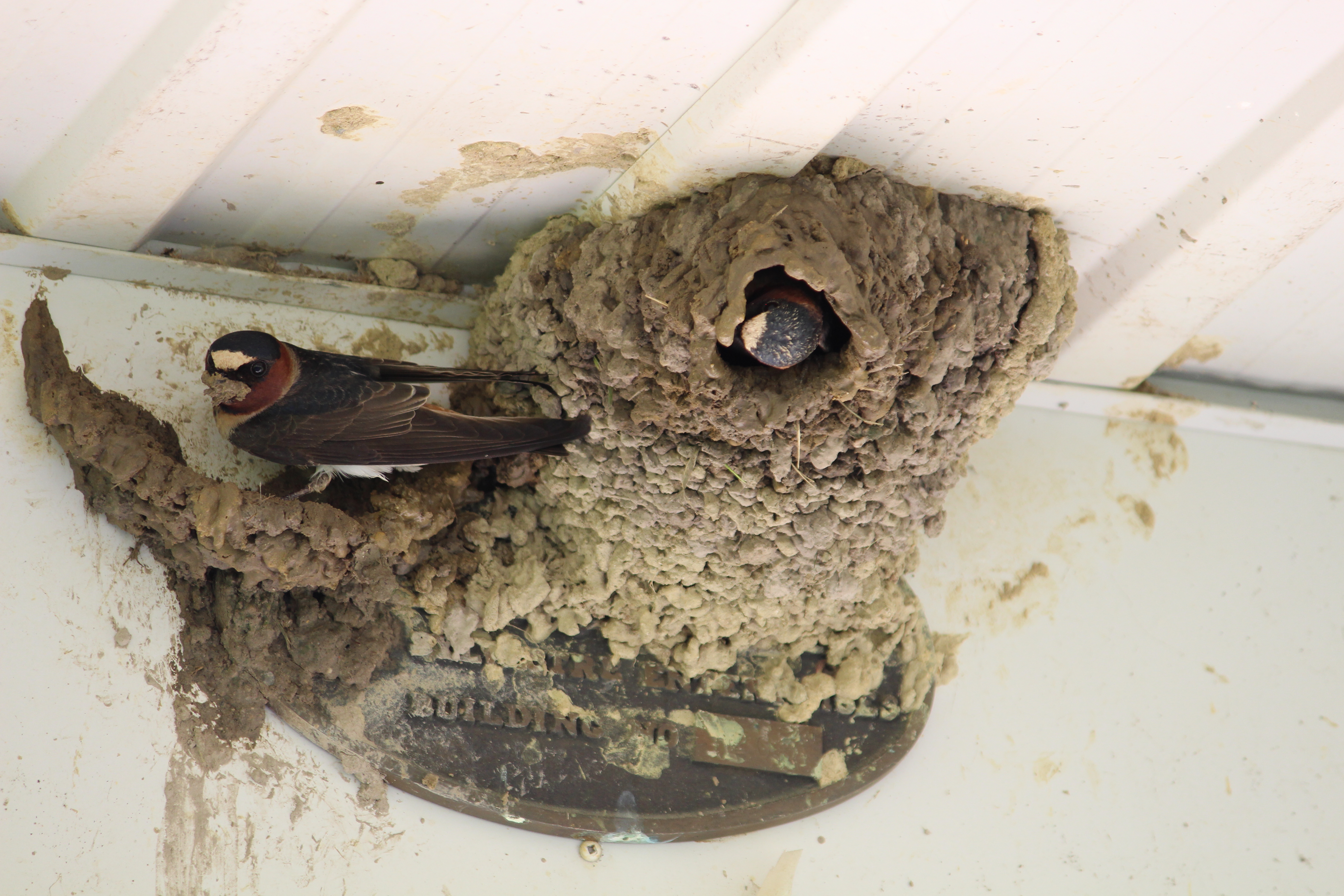 Cliff Swallows appear very similar to Barn Swallows in their nest construction, location and their physical appearance. Cliff Swallow nests are similar mud nests, but have a downward facing entrance rather than an open bowl like the Barn Swallow nest. Cliff Swallows will occasionally use the remains of Barn Swallow nests as a beginning point for their own constructions (del Hoyo et. al. 2004). Like all the swallows I saw, and all Hirundinids in Ontario, these birds arrive in Spring, breed and then depart in the Fall. As Swallows are dependent on insects (especially flying insects) for food, they can’t stay within northern areas during the winter when insects rarely if ever fly and most are hidden away and dormant.