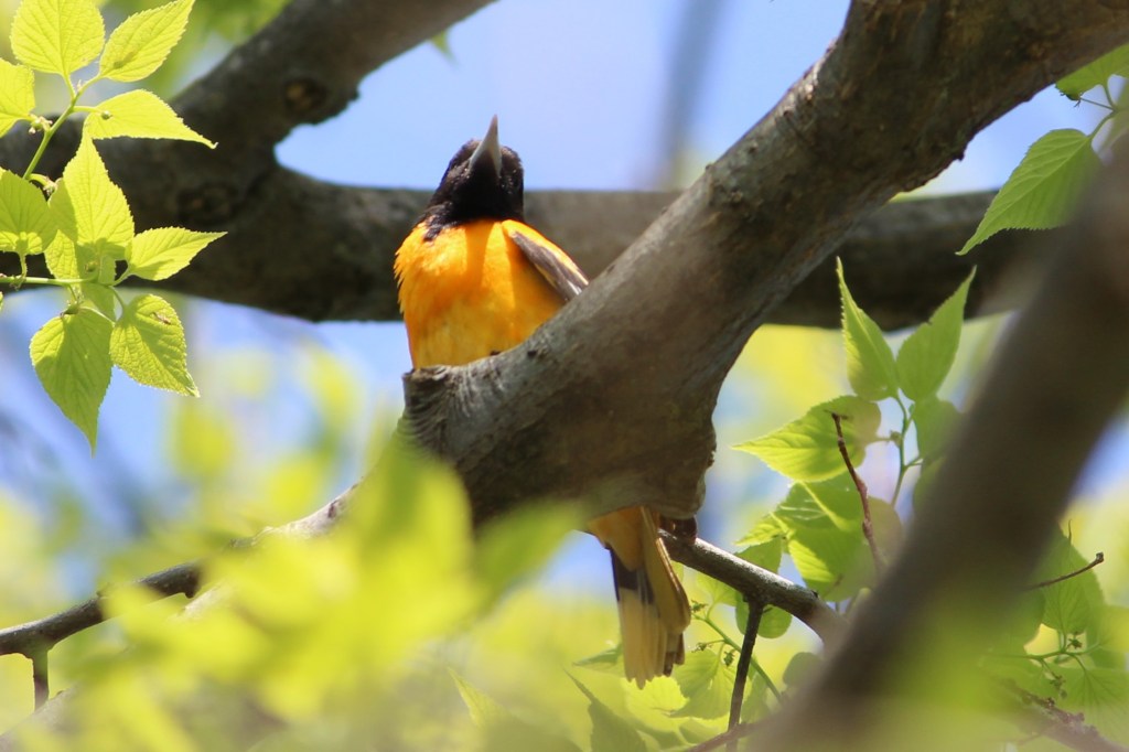 Orioles are a beautiful and welcome Spring migrant here in Southern Ontario. Of all the backyard birds that I have seen and photographed, Baltimore Orioles* seem to bring the Tropics north with them. Their brilliant colours, sharp and clear song, and fruit-seeking behaviour all seem to show how at-home they would be among the tropical rainforests they live in for half the year. Every year, I await the return of these beautiful birds to my backyard where they scoop up grape jelly in their long and thin beaks.