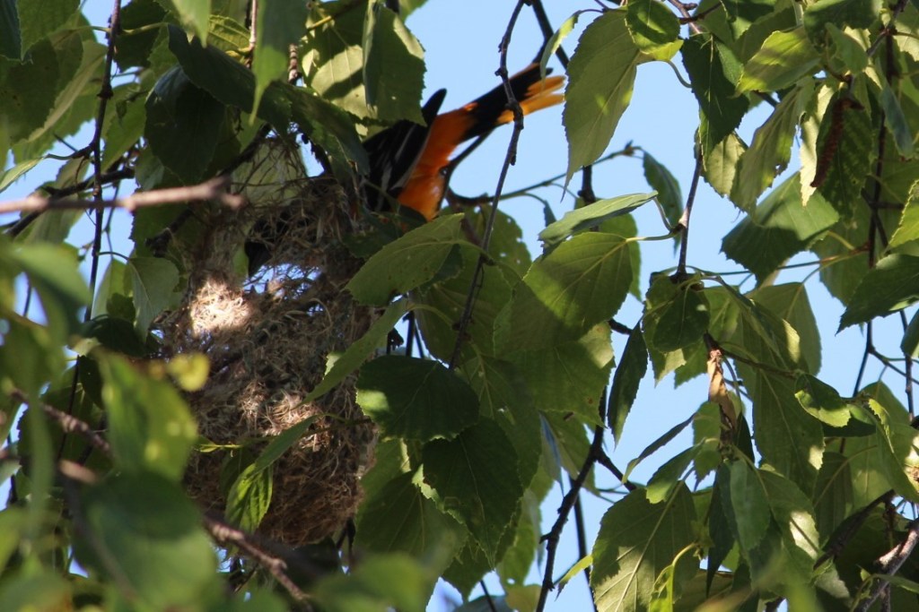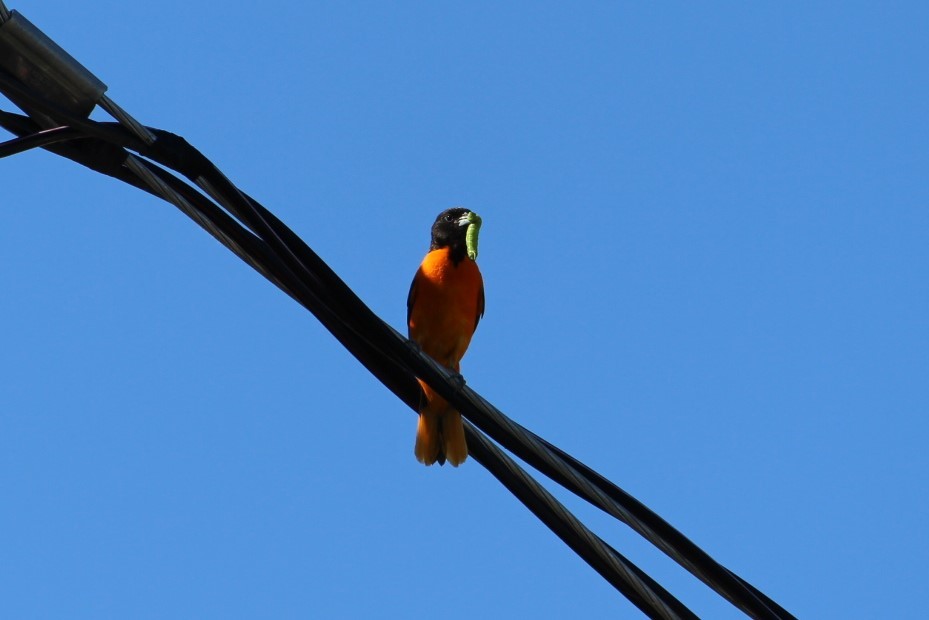 Here is the male Oriole delivering his caterpillar prey to his nestlings.