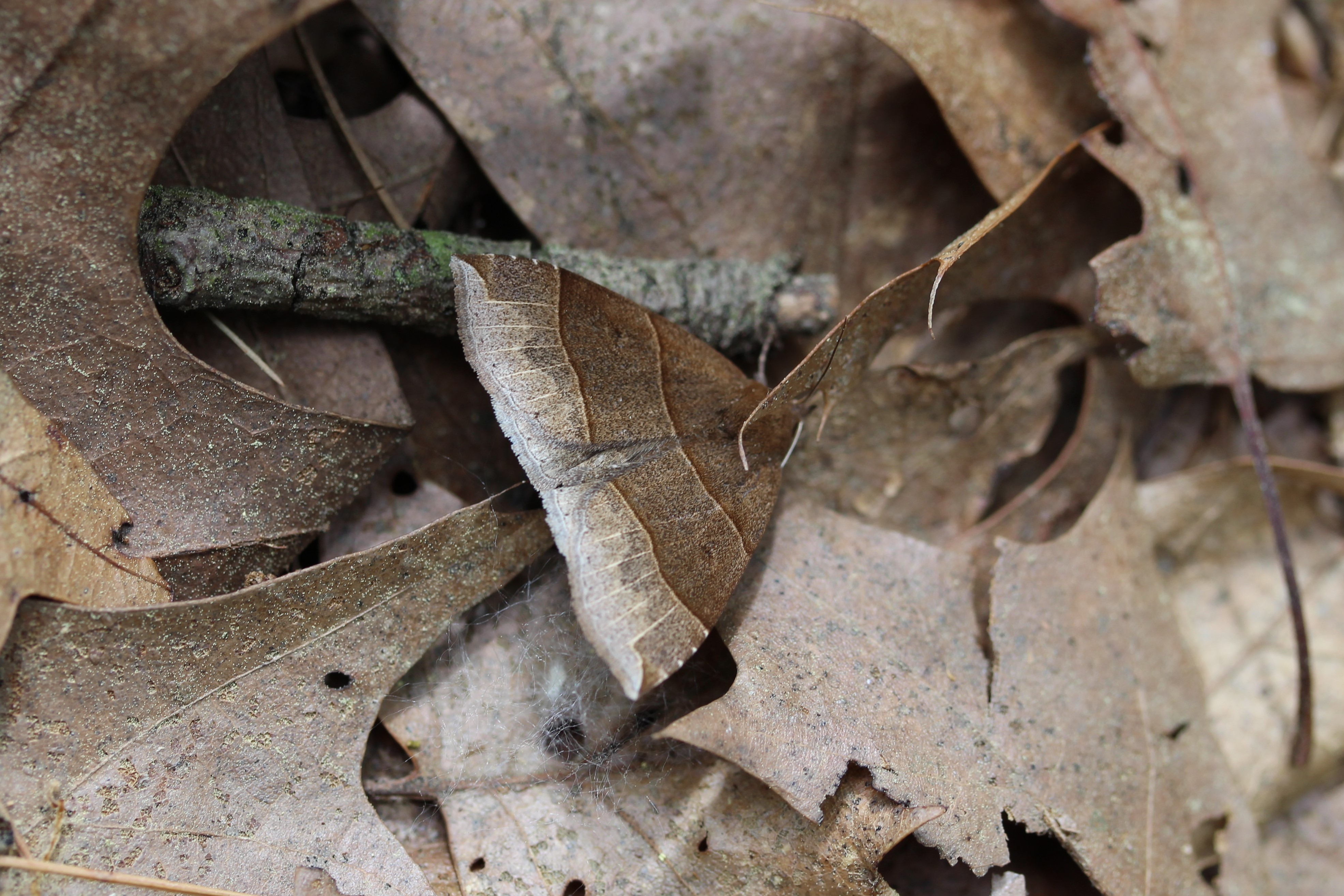 This moth could be the poster-child for camouflage. Such an elegant example of hiding-in-plain-sight. Positioned among fallen leaves which it matches in tone and general shape, this moth is incredibly hard to spot! To hide itself even more, the Maple Looper Moth positions itself head down, thus hiding its least leaf-like feature and accentuating the lighter edge of its hindwings (Keiper 1969).