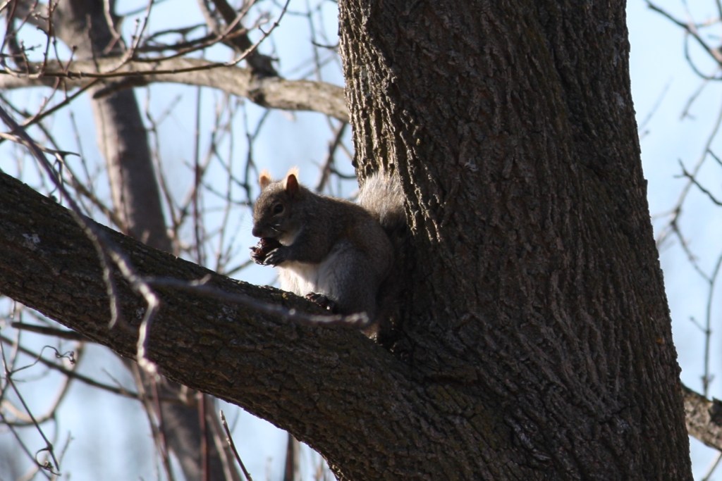 A recent observation reported in The Canadian Field Naturalist journal represents another of these striking behaviours that stands out because it is atypical for the species as a whole. The species concerned is one that many people are very familiar with: the Eastern Grey Squirrel (Sciurus carolinensis). There are already accounts of various Squirrel species hunting and feeding on other vertebrate animals, including birds and even other Grey Squirrels (ie. Cannibalism) (Squirrels as Predators, Callahan 1993). Perhaps more surprising is the recent report of hunting an animal that is outside of its normal environment: namely, a fish. In Guelph, Ontario, a Squirrel was seen to dive from a branch headfirst into a shallow portion of a river. After being underwater for a few seconds “the squirrel swam back to the snag with a fish 3-5 cm long in its mouth” (Sutton et. al. 2020). After feeding on the fish briefly, the Squirrel moved out of view into the woods.